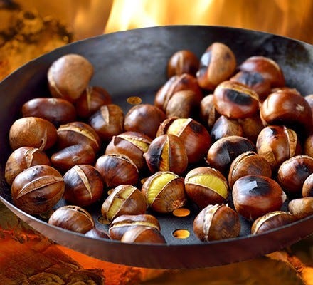 It’s less “Chestnuts roasting on an open fire” that herald Christmas for me than chestnuts roasting in glowing braziers along Oxford and other Streets of London. There’s something very specific about their smell, in the same way the smell of barbecues evokes pleasures of a very particular kind. Growing up, that sweet smokiness was a regular part of Christmas. My mother had unearthed a proper chestnut roaster in an antique shop for a few shillings. It was a brass square lidded affair into which we dropped the chestnuts, lightly scored to prevent them bursting, to set onto the embers of the sitting-room blaze, shaking it every so often.
